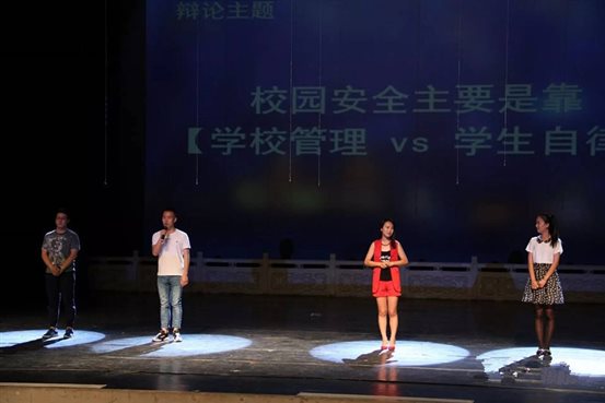第二环节是“校园安全说”,在此环节中晋级的两支联队派代表进行自由辩论。辩论的枪声打响后,场上双方辩手你来我往,唇枪舌战,围绕着辩题展开了激烈的辩论。辩论中选手们依然不失风度,始终面带微笑,侃侃而谈。良好的风范、出色的口才、敏捷的思维令场下观众为之折服,掌声不断。